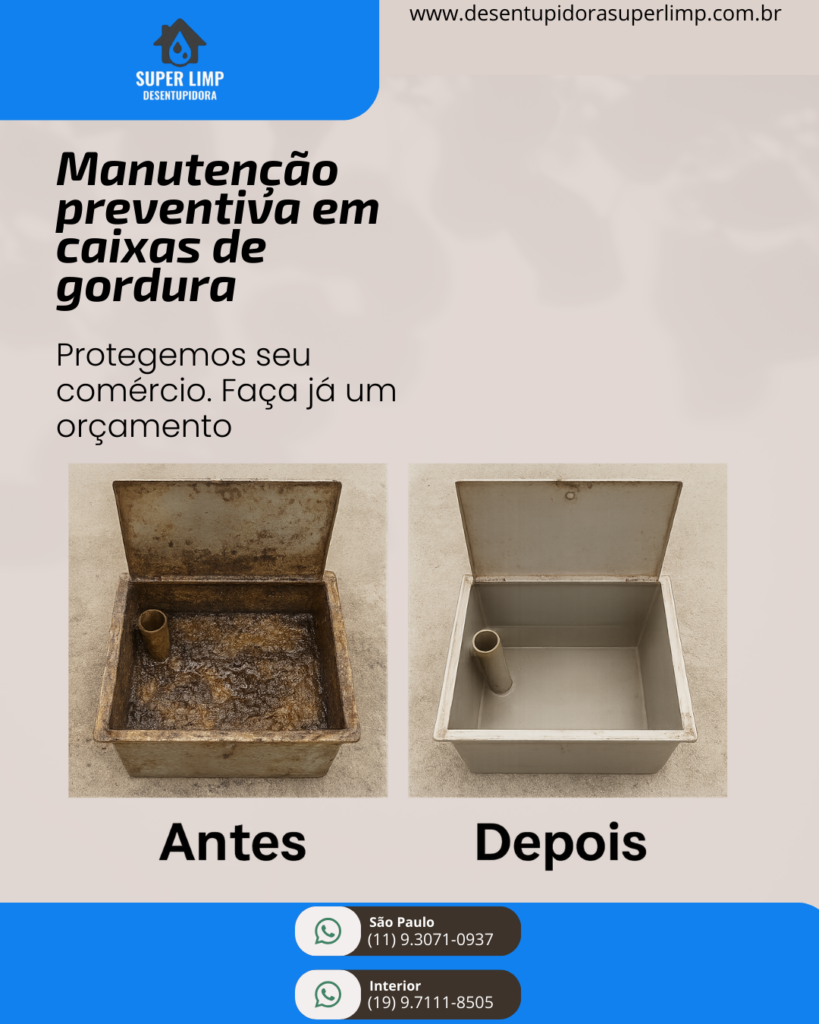 Entupimentos não avisam — surgem de repente, durante a noite, nos fins de semana ou até em feriados. É por isso que oferecemos serviço de desentupidora 24 horas no Ipiranga, sempre prontos para agir com rapidez. Seja um esgoto retornando, ralo com mau cheiro ou um vaso sanitário transbordando, nossa equipe atua com equipamentos modernos, precisão no diagnóstico e execução imediata. Com a SuperLimp, você tem suporte técnico de confiança em qualquer momento do dia, garantindo que o problema seja resolvido com agilidade, segurança e sem complicações.
